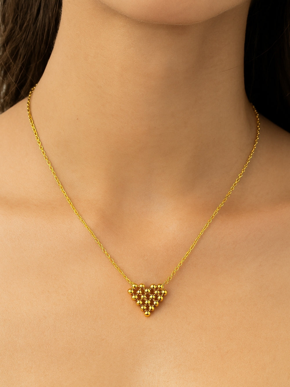 The Lumora Necklace combines a minimalist heart with fine ball accents. Lightweight, versatile, and effortlessly chic.