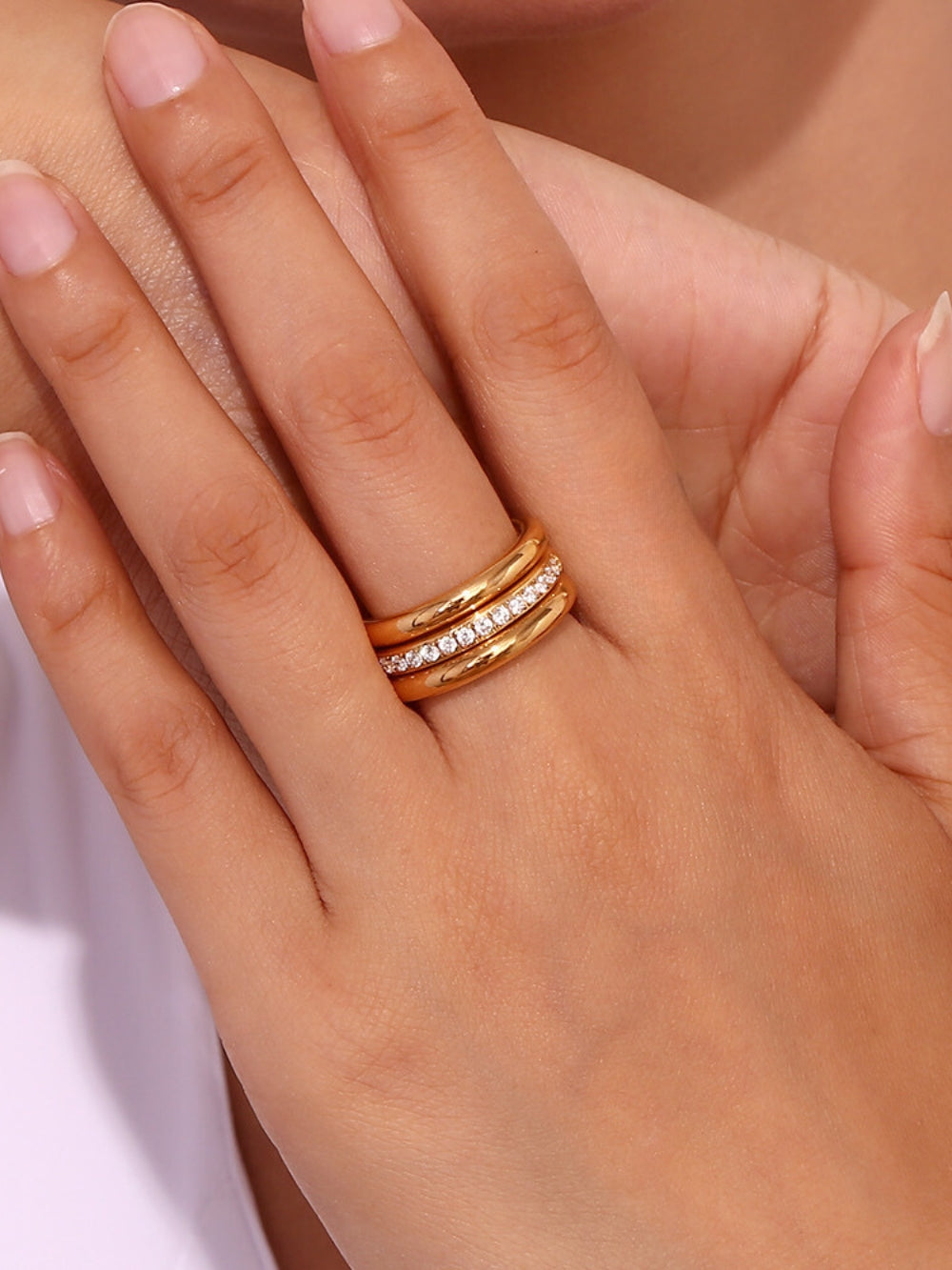 Three sculpted bands in one seamless form. Sleek, bold, and finished with a row of brilliant diamonds.