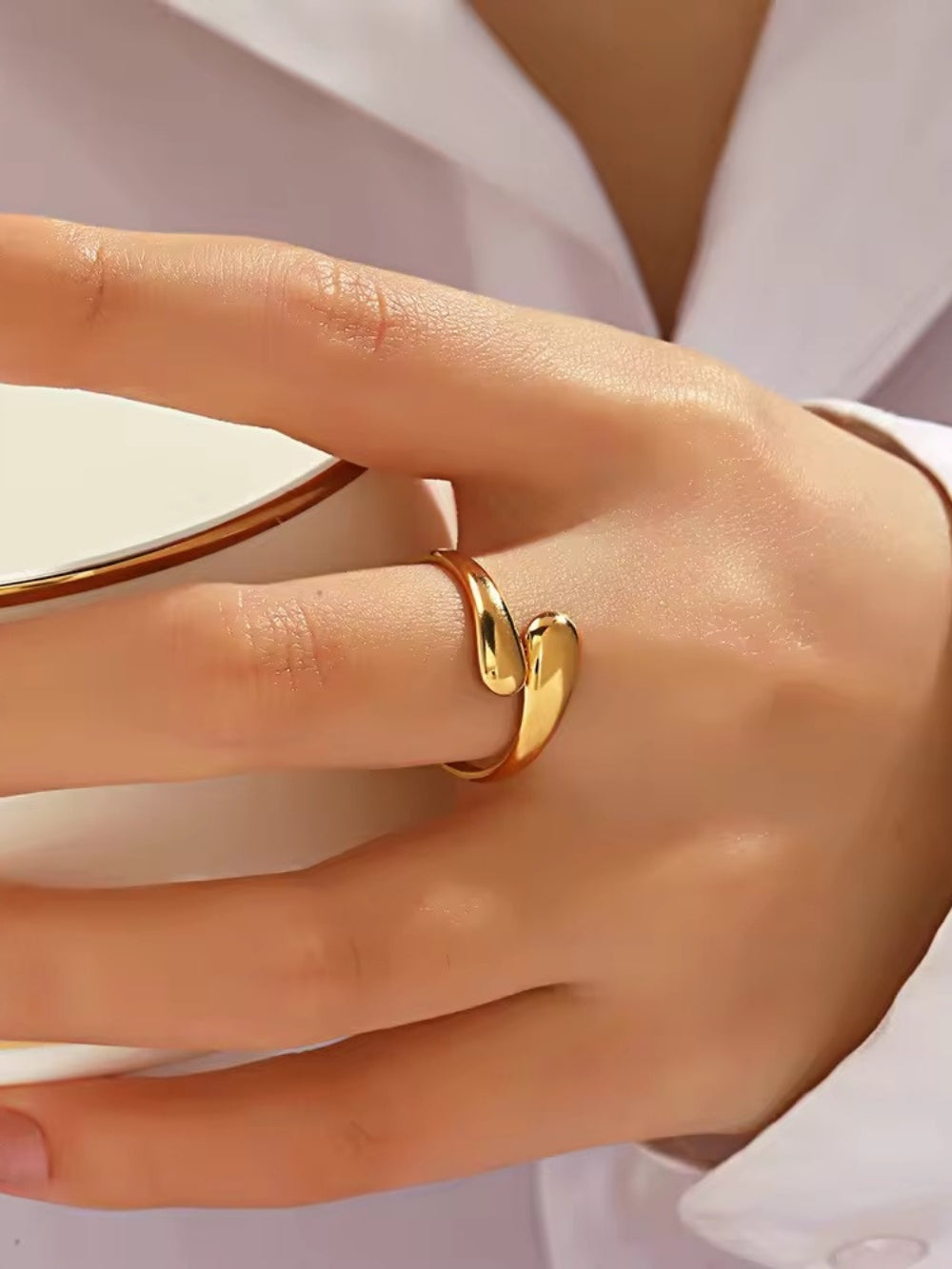 The Evade Ring captures the beauty of fluidity with its sleek, overlapping curves that flow seamlessly around the finger.